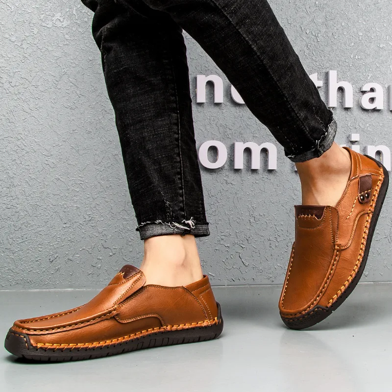 Men's Handmade Stitched Business Leather Shoes Soft Soled Cowhide Casual Driving Shoes Loafers
